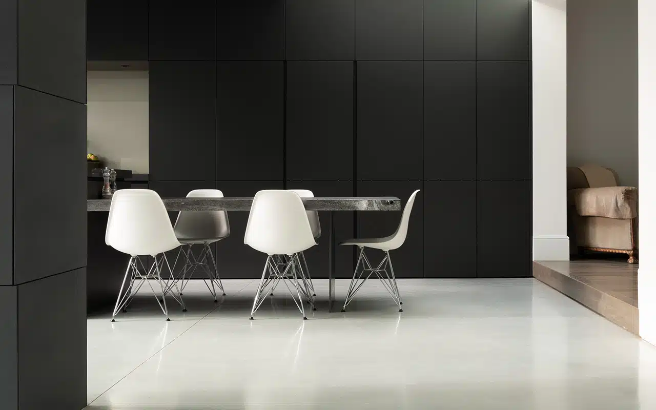 To create instant drama play with stark monochromes and geometric lines. Here, Robert Dye Architects have used our Off White polished concrete (satin finish) to create a sensational black and white kitchen.
