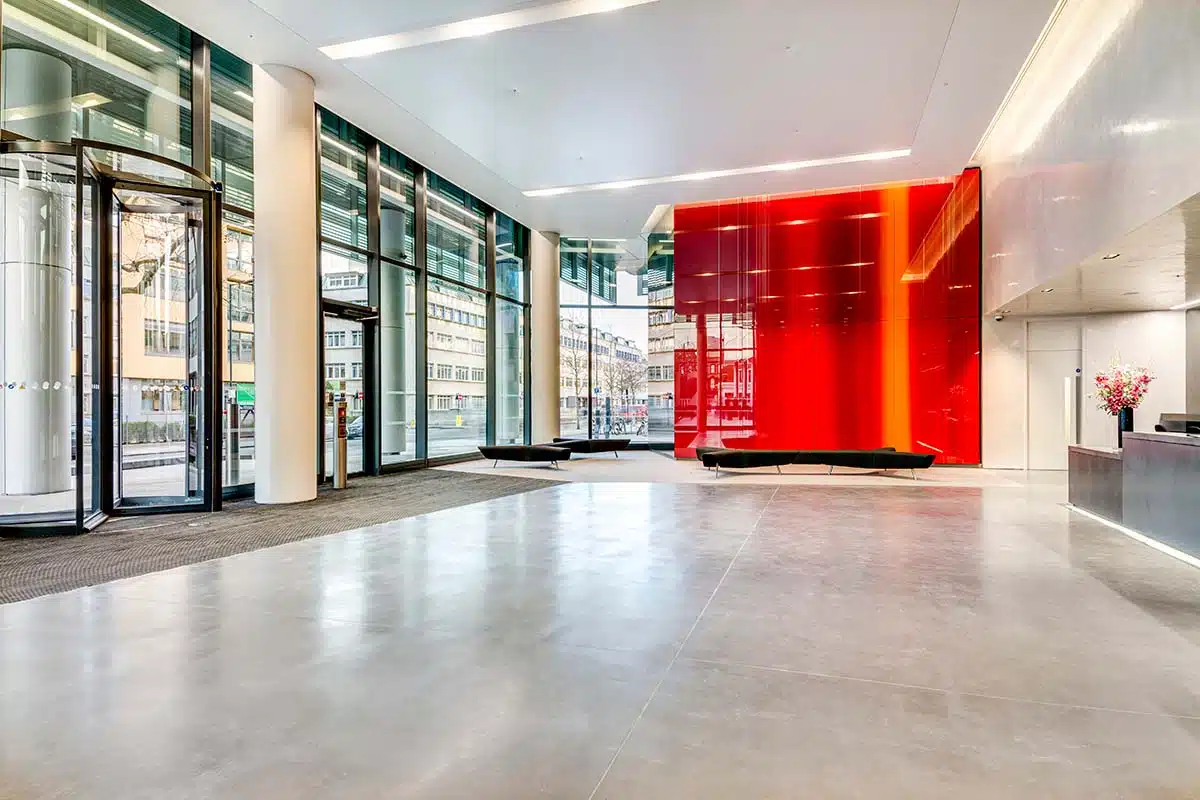 Lazenby’s Basalt Polished Concrete Floors complement an Azure Grey GFC Reception Desk. Basalt has been installed in 276m² on the ground floor and in 44m², on every level, for 10 lift lobbies throughout the building. Azure Grey pre-cast concrete tiles are in every lift and at the threshold of every lift throughout the London building.