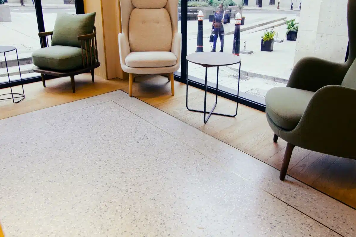 To get around this wrinkle we chose a low shrink concrete that would allow us to move between the different depths more easily. After this had cured we came back and fitted around 200m of brass rails based on the architects’ exacting design. The Terrazzo system was then installed and diamond polished to create an absolutely stunning end result for this London building.