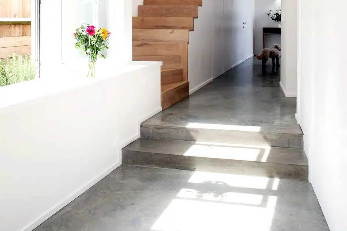 Lazenby’s 100mm deep Cool Grey polished concrete was laid over underfloor heating and A252 reinforcing mesh. The C28/35 concrete, to BS EN 206-1 and BS 8500-2, has GGBS/cement substitutes to help with BREAM certification. This new self build factored in Lazenby’s polished concrete floors, on split levels, from the beginning.