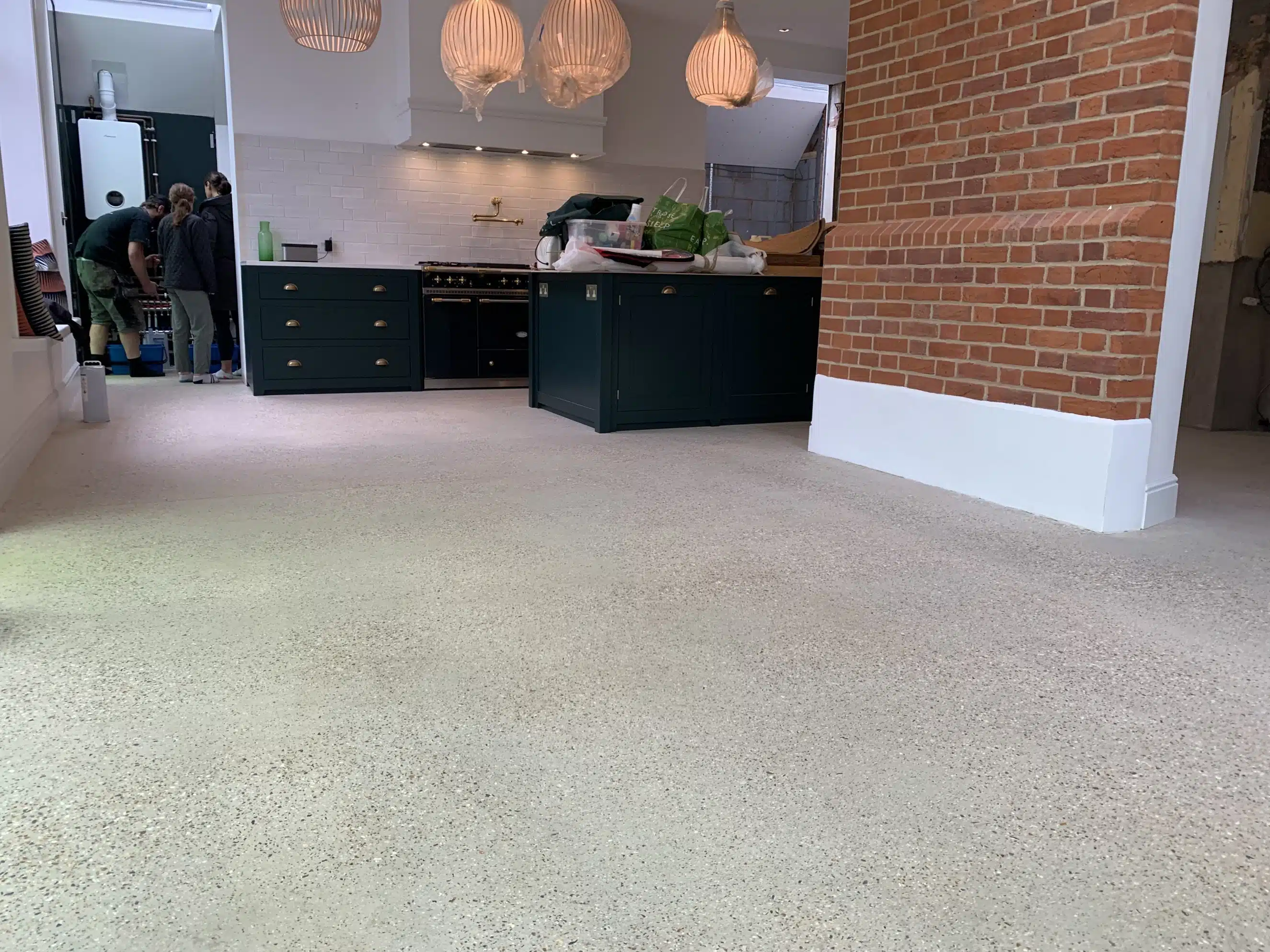 The clients were looking to create an industrial finish with their concrete flooring in London which covers around 80 m2 in an open plan kitchen/dining area. We provided a selection of samples for the clients to choose from, all utilising local materials. To try and avoid the floor feeling too grey, they opted for a white integral colour to be used in the concrete mix which provided a much lighter background colour than standard concrete.