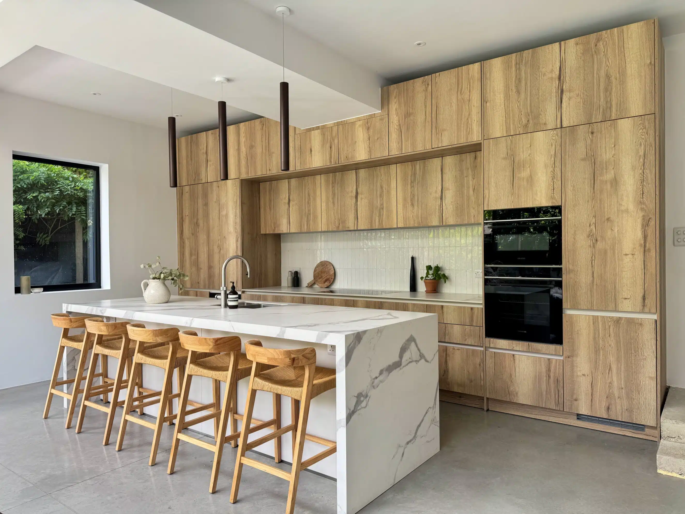 The soft grey surface anchors the home’s natural material palette, contrasting beautifully with warm timber detailing and marble accents. Seamless transitions between the open-plan interior and exterior terrace create a sense of fluidity and space — ideal for relaxed, indoor-outdoor living (and a little afternoon sunbathing).